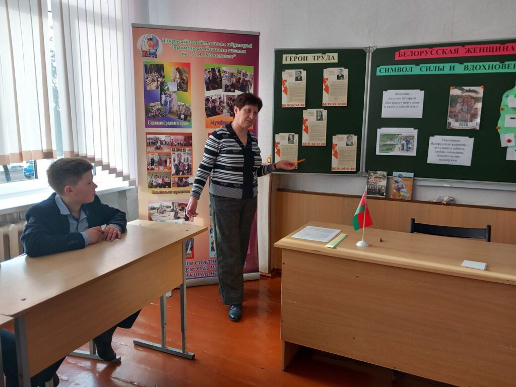 С целью формирования представления о значимой роли белорусских женщин в истории и современной жизни общества, воспитания уважительного отношения к женщине-матери, труженице, профессионалу в учреждении образования прошли единые уроки на тему «Белорусская женщина — символ силы и вдохновения»