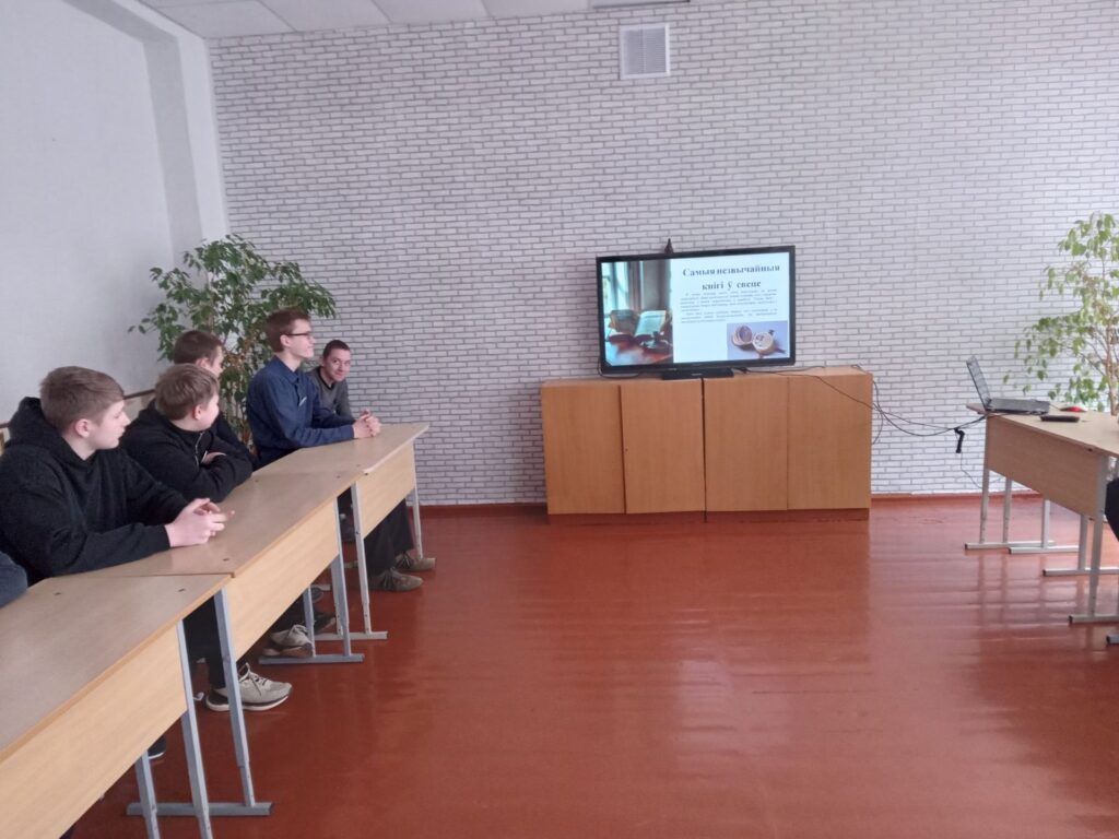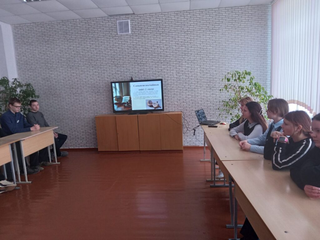 Відэапрэзентацыя «Самыя незвычайныя кнігі ў свеце» зацікавіла вучняў 5 — 9 класаў. Яны пазнаёміліся з самай вялікай і самай малой кнігамі ў свеце, як і чым могуць быць напісаны кнігі. ХХІ стагоддзе — стагоддзе новых тэхналогій. Якія новыя тэхналогіі выкарыстоўваюцца для стварэння кніг і якія сучасныя кнігі ёсць — аб гэтым даведаліся з прэзентацыі вучні.
